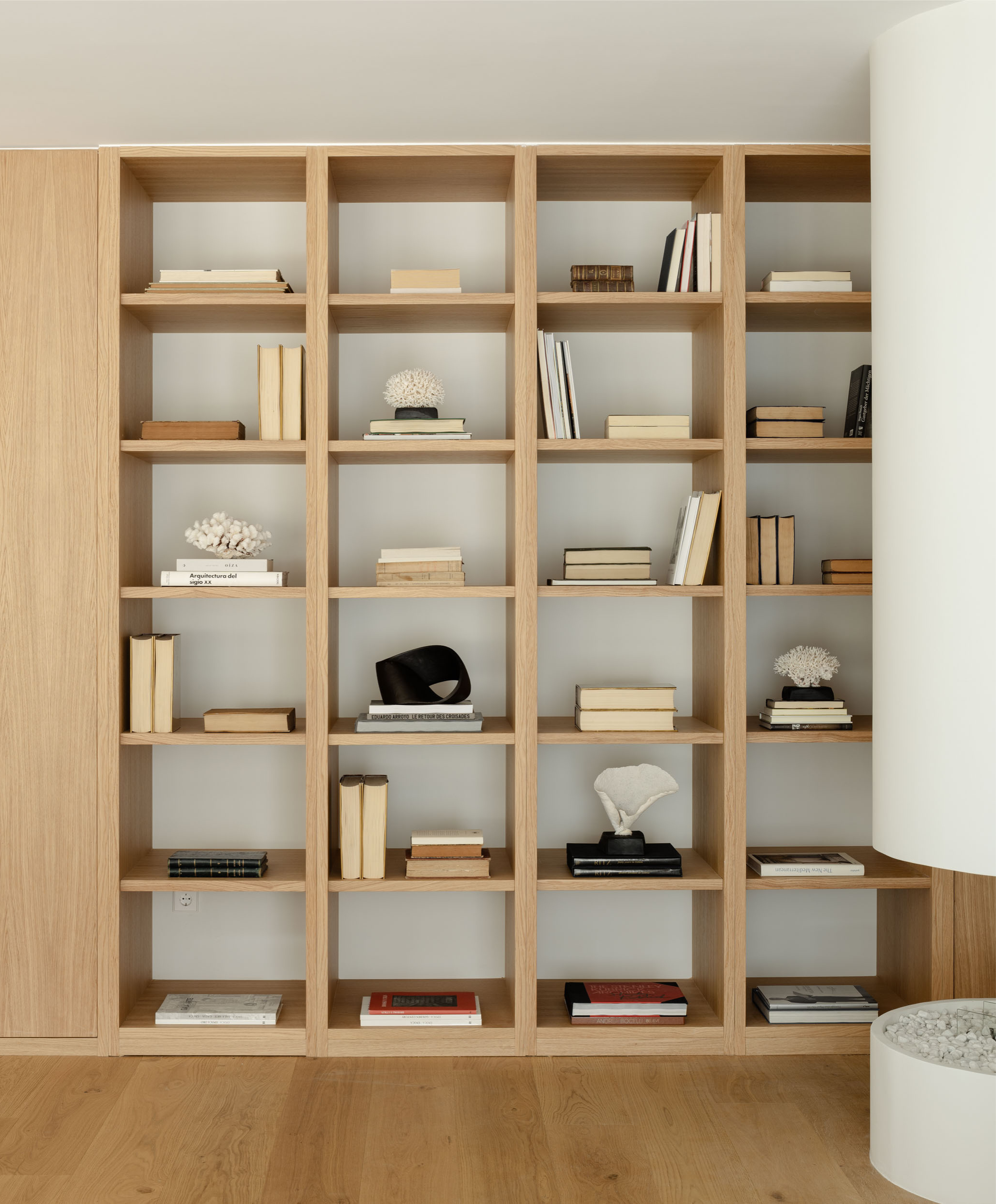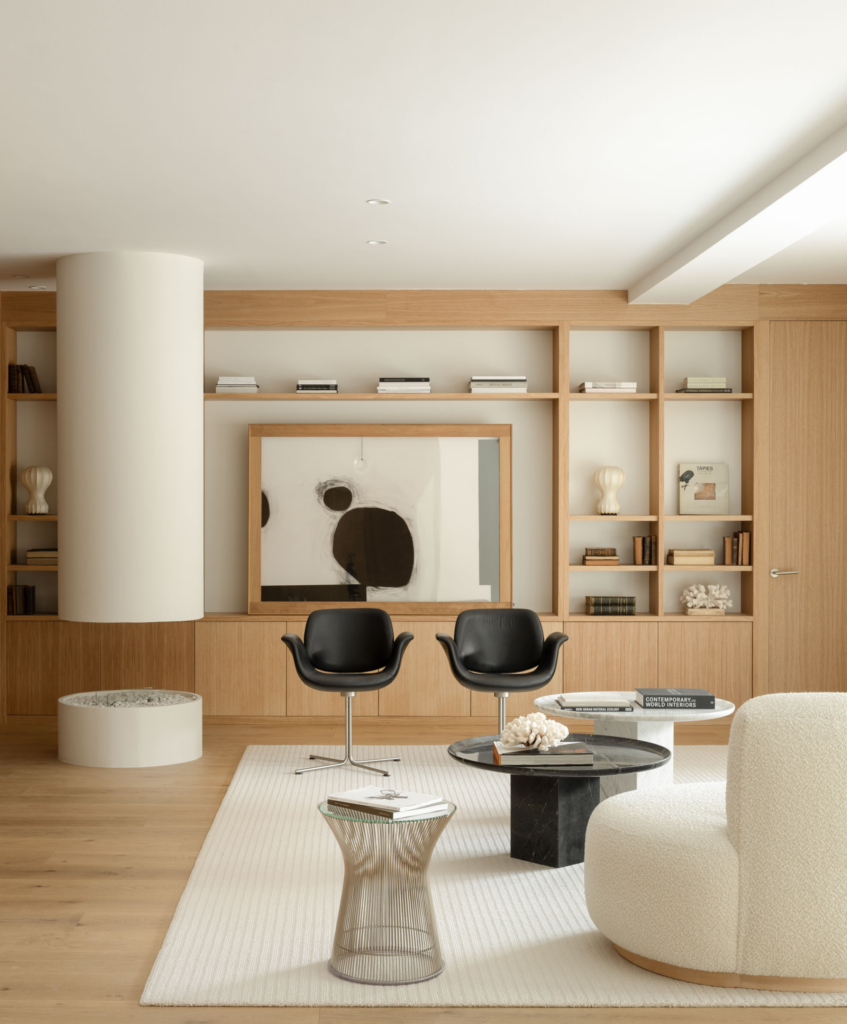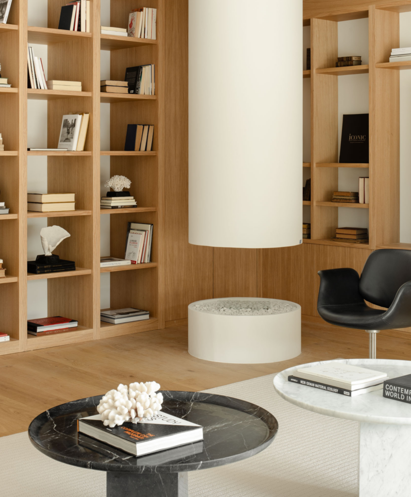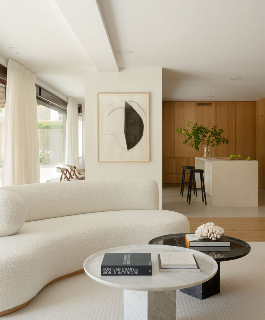 Al entrar en Casa Hoy, el visitante es recibido por un ambiente que respira calidad y calidez. En la zona de descanso, el sofá Lavelle se sitúa como el punto focal del espacio, creando un rincón acogedor frente a la librería. Su curvatura suave y su tono blanco se integran perfectamente con las mesas de centro de mármol Carrara y Marquina de Judith San Quintín, así como con la obra de Dominca Sánchez que adorna la pared, generando un entorno que invita a la relajación y a la convivencia familiar.